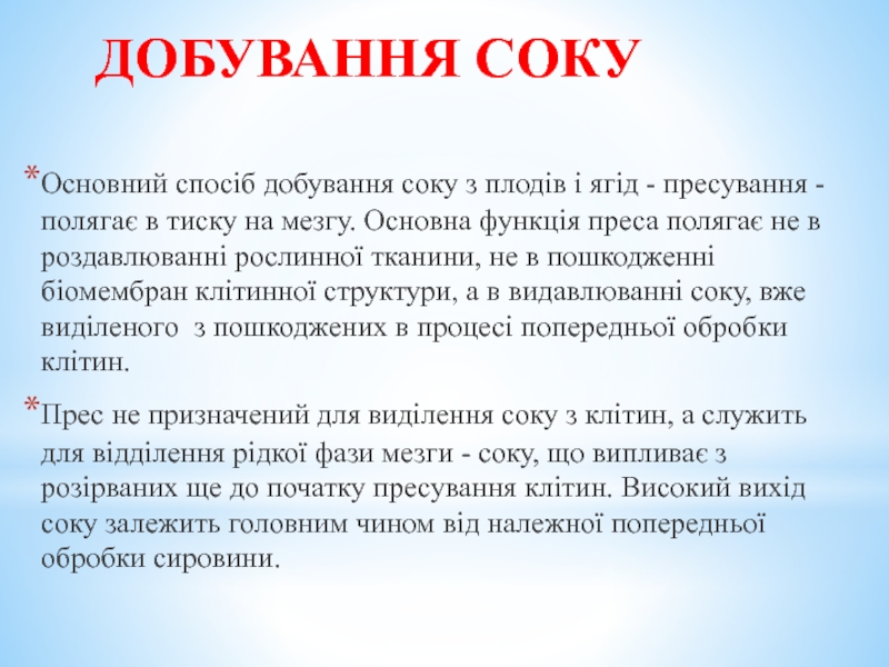 преса полягає не в роздавлюванні рослинної тканини, не в пошкодженні біомембран клітинної структури, а в видавлюванні соку, вже виділеного з пошкоджених в процесі попередньої обробки клітин.