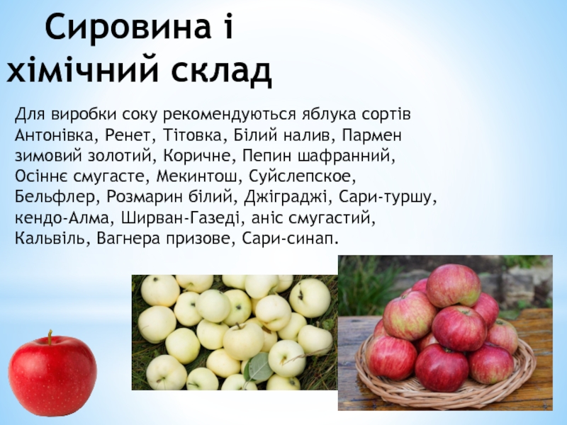Антонівка, Ренет, Тітовка, Білий налив, Пармен зимовий золотий, Коричне, Пепин