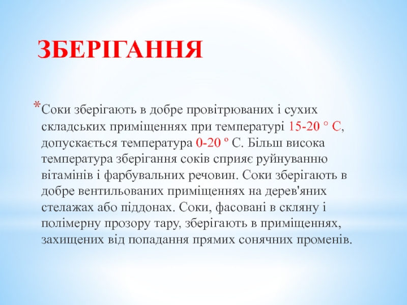 висока температура зберігання соків сприяє руйнуванню вітамінів і фарбувальних речовин. Соки зберігають в добре вентильованих приміщеннях на дерев'яних стелажах або піддонах. Соки, фасовані в скляну і полімерну прозору тару, зберігають в приміщеннях, захищених від попадання прямих сонячних променів.