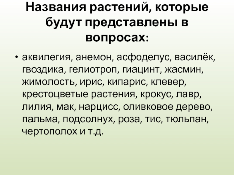 Слайд 15Названия растений, которые будут представлены в вопросах:
