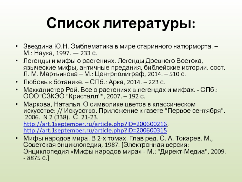 Маркова, Наталья. О символике цветов в классическом искусстве: // Искусство. Приложение к газете "Первое сентября". 2006. N 2 (338). С. 21-23. http://art.1september.ru/article.php?ID=200600216, http://art.1september.ru/article.php?ID=200600315