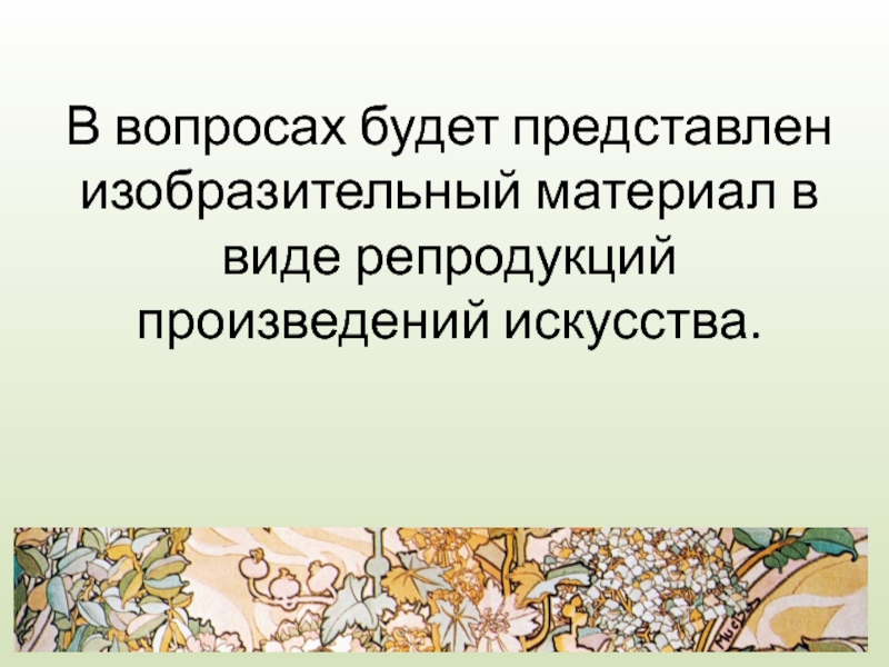 Слайд 12В вопросах будет представлен изобразительный материал в виде репродукций произведений