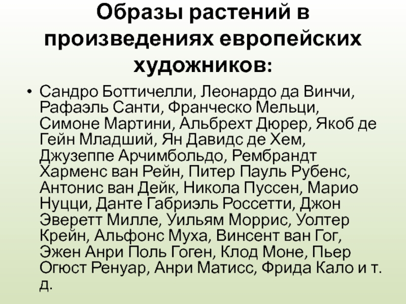 де Гейн Младший, Ян Давидс де Хем, Джузеппе Арчимбольдо, Рембрандт Харменс ван Рейн, Питер Пауль Рубенс, Антонис ван Дейк, Никола Пуссен, Марио Нуцци, Данте Габриэль Россетти, Джон Эверетт Милле, Уильям Моррис, Уолтер Крейн, Альфонс Муха, Винсент ван Гог, Эжен Анри Поль Гоген, Клод Моне, Пьер Огюст Ренуар, Анри Матисс, Фрида Кало и т.д.