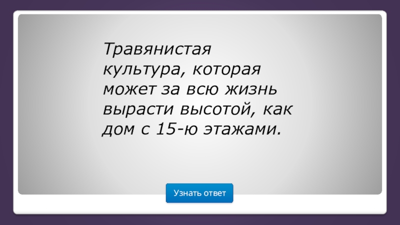 Узнать ответТравянистая культура, которая может за всю жизнь вырасти высотой, как дом с 15-ю этажами.