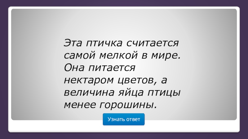 Узнать ответЭта птичка считается самой мелкой в мире. Она питается нектаром цветов, а величина яйца птицы менее