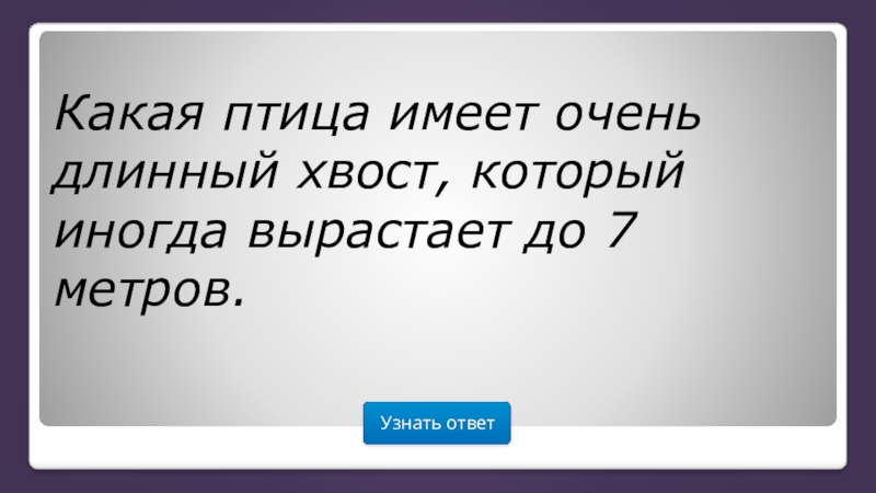 Узнать ответКакая птица имеет очень длинный хвост, который иногда вырастает до 7 метров.