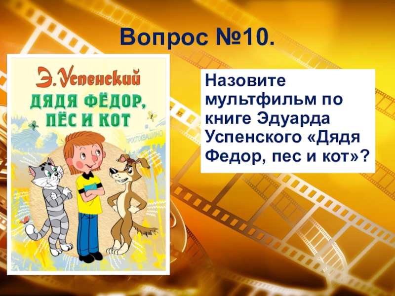 Вопрос №10.Назовите мультфильм по книге Эдуарда Успенского «Дядя Федор, пес и кот»?