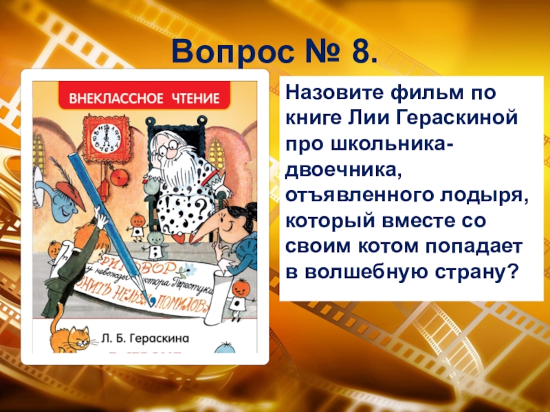 Вопрос № 8.Назовите фильм по книге Лии Гераскиной про школьника-двоечника, отъявленного лодыря, который вместе со своим котом