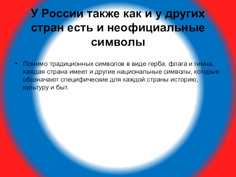 каждая страна имеет и другие национальные символы, которые обозначают специфические для каждой страны историю, культуру и быт.