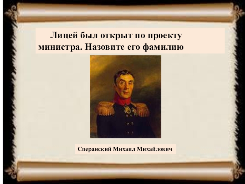 Лицей был открыт по проекту    	министра. Назовите его фамилиюСперанский Михаил Михайлович