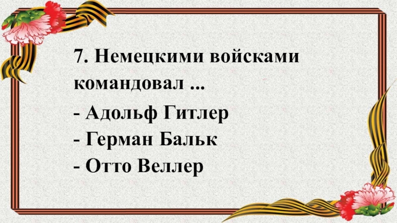 7. Немецкими войсками командовал ...- Адольф Гитлер- Герман Бальк- Отто Веллер