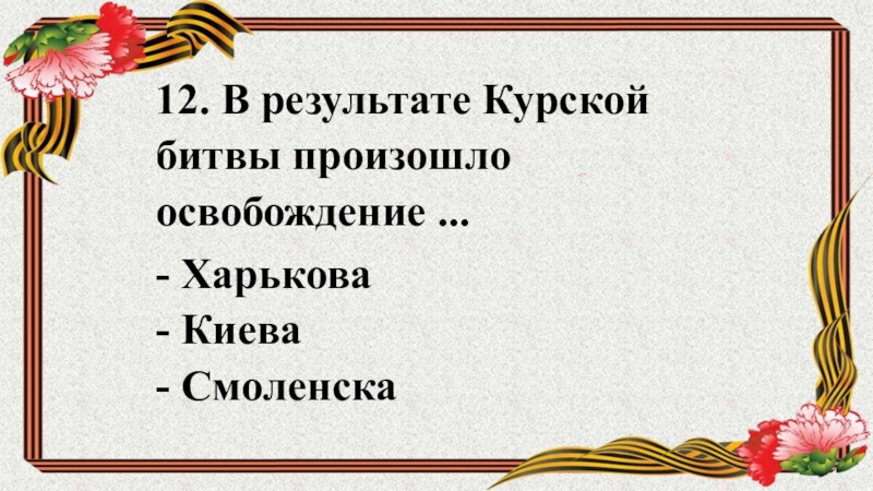12. В результате Курской битвы произошло освобождение ...- Харькова- Киева- Смоленска