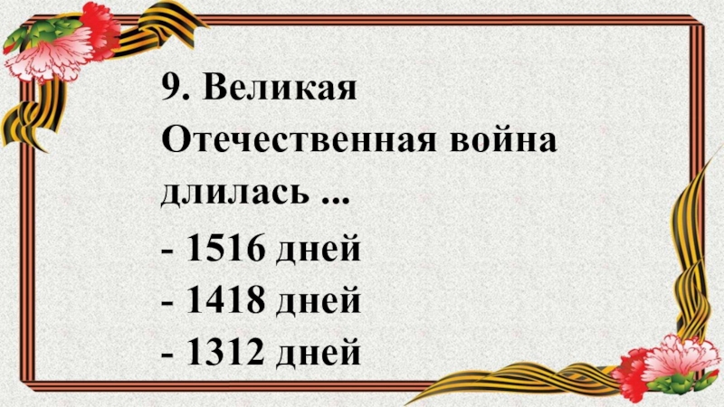 9. Великая Отечественная война длилась ...- 1516 дней- 1418 дней- 1312 дней