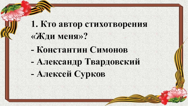 1. Кто автор стихотворения «Жди меня»?- Константин Симонов- Александр Твардовский- Алексей Сурков