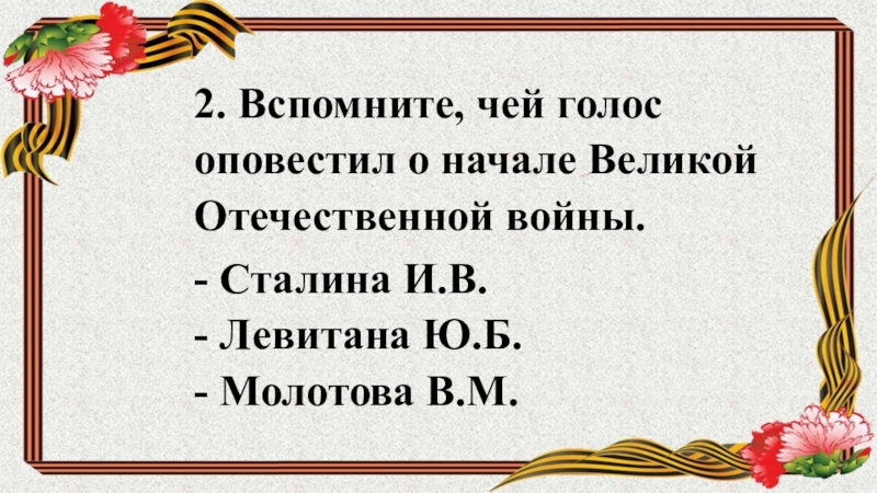 2. Вспомните, чей голос оповестил о начале Великой Отечественной войны.- Сталина И.В.- Левитана Ю.Б.- Молотова В.М.