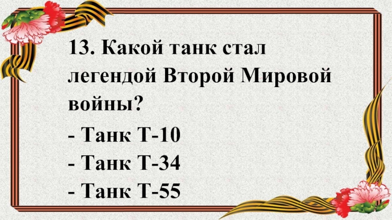 13. Какой танк стал легендой Второй Мировой войны?- Танк Т-10- Танк Т-34- Танк Т-55
