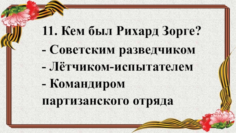 11. Кем был Рихард Зорге?- Советским разведчиком- Лётчиком-испытателем- Командиром  партизанского отряда