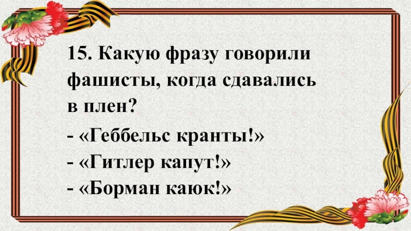 15. Какую фразу говорили фашисты, когда сдавались в плен?- «Геббельс кранты!»- «Гитлер капут!»- «Борман каюк!»
