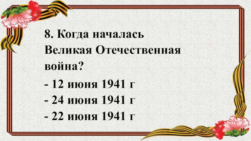 8. Когда началась Великая Отечественная война?- 12 июня 1941 г- 24 июня 1941 г- 22 июня 1941