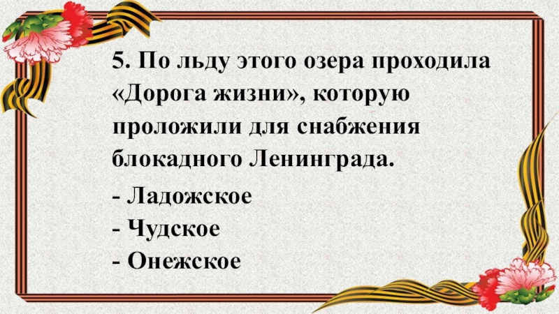 5. По льду этого озера проходила «Дорога жизни», которую проложили для снабжения блокадного Ленинграда.- Ладожское- Чудское- Онежское