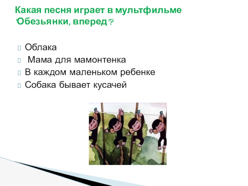 Слайд 21Музыка из мультфильма «Обезьянки, вперёд!»