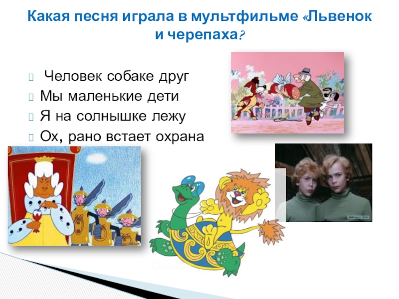 Человек собаке другМы маленькие дети Я на солнышке лежу Ох, рано встает охранаКакая песня играла в мультфильме «Львенок и