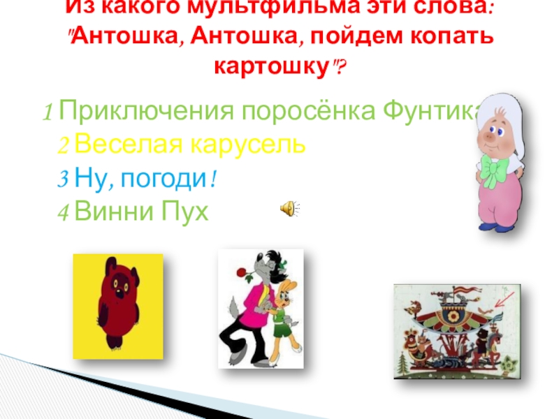 1 Приключения поросёнка Фунтика  2 Веселая карусель  3 Ну, погоди!  4 Винни ПухИз какого мультфильма эти слова: "Антошка, Антошка, пойдем копать картошку"?