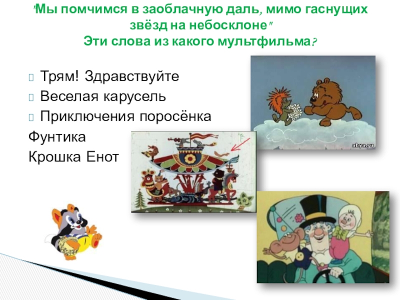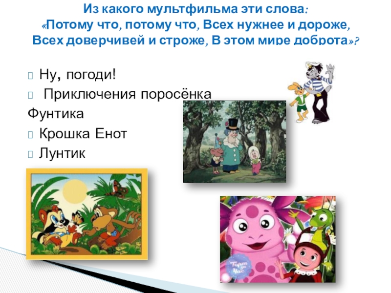 Слайд 21 Приключения поросёнка Фунтика  2 Веселая карусель  3 Ну, погоди!  4 Винни Пух