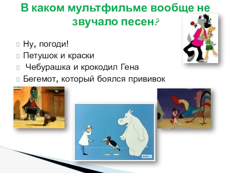 Ну, погоди!Петушок и краски  Чебурашка и крокодил ГенаБегемот, который боялся прививок В каком мультфильме вообще не звучало песен?