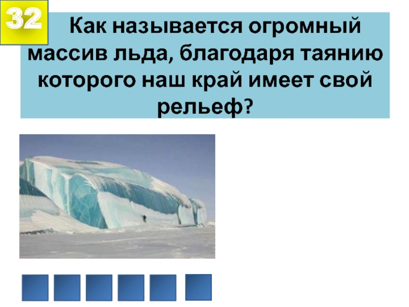 Слайд 35 Как называется огромный массив льда, благодаря таянию которого наш край