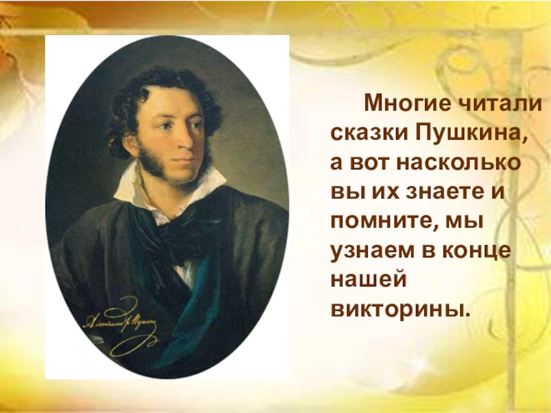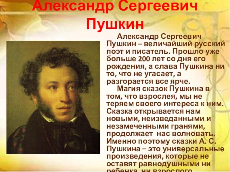 дня его рождения, а слава Пушкина ни то, что не угасает, а разгорается все ярче.Магия сказок Пушкина в том, что взрослея, мы не теряем своего интереса к ним. Сказка открывается нам новыми, неизведанными и незамеченными гранями, продолжает нас волновать. Именно поэтому сказки А. С. Пушкина – это универсальные произведения, которые не оставят равнодушными ни ребенка, ни взрослого.