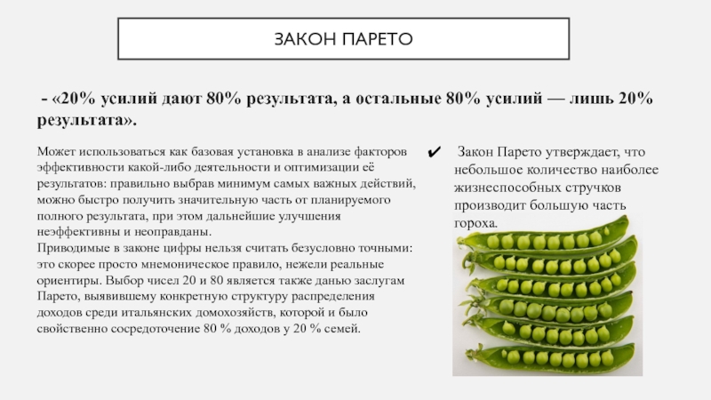 Закон Парето утверждает, что небольшое количество наиболее жизнеспособных стручков производит большую часть гороха.