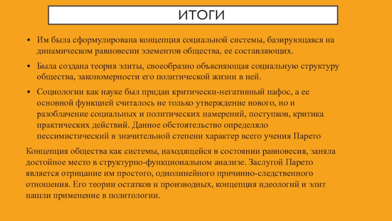 Концепция общества как системы, находящейся в состоянии равновесия, заняла достойное место в структурно-функциональном анализе. Заслугой Парето является отрицание им простого, однолинейного причинно-следственного отношения. Его теории остатков и производных, концепция идеологий и элит нашли применение в политологии.