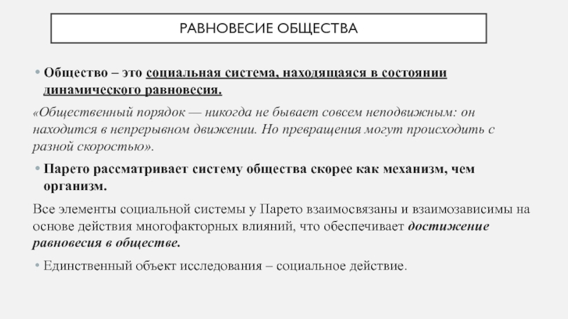 Все элементы социальной системы у Парето взаимосвязаны и взаимозависимы на основе действия многофакторных влияний, что обеспечивает достижение равновесия в обществе.