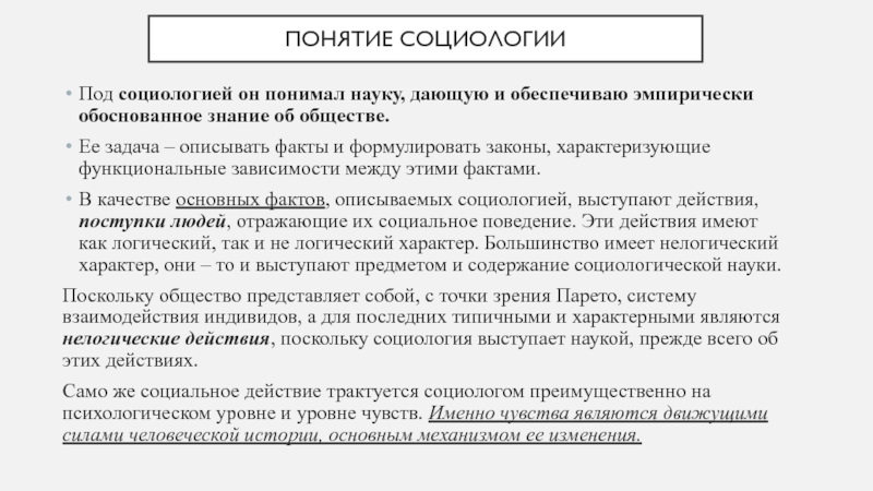 В качестве основных фактов, описываемых социологией, выступают действия, поступки людей, отражающие их социальное поведение. Эти действия имеют как логический, так и не логический характер. Большинство имеет нелогический характер, они – то и выступают предметом и содержание социологической науки.