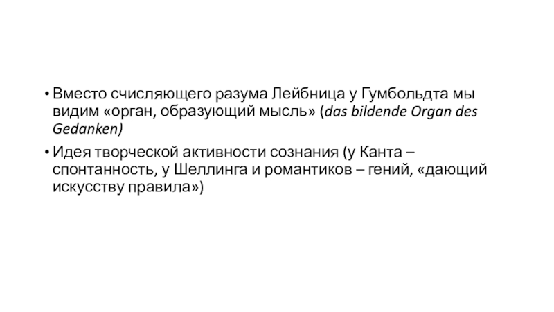 Слайд 13Вместо счисляющего разума Лейбница у Гумбольдта мы видим «орган, образующий