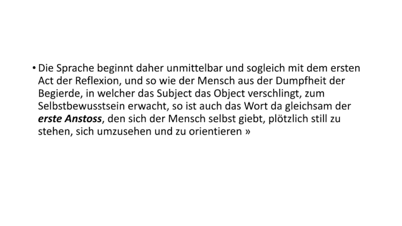 Dumpfheit der Begierde, in welcher das Subject das Object verschlingt, zum Selbstbewusstsein erwacht, so ist auch das Wort da gleichsam der erste Anstoss, den sich der Mensch selbst giebt, plötzlich still zu stehen, sich umzusehen und zu orientieren »