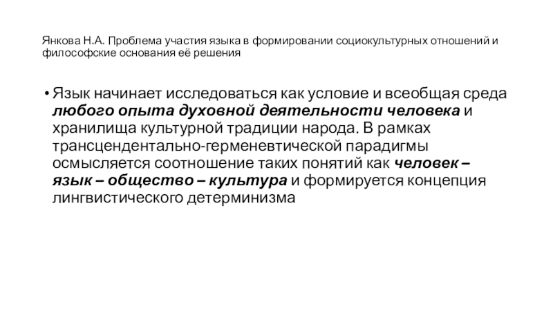 Слайд 40Янкова Н.А. Проблема участия языка в формировании социокультурных отношений и