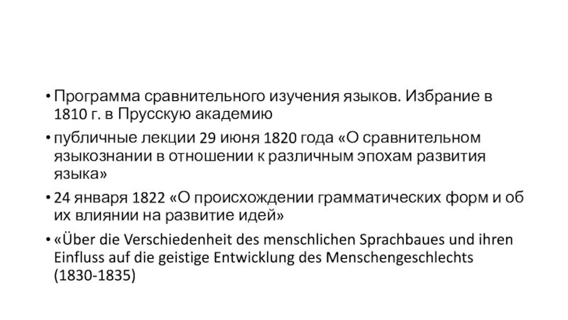 Слайд 4Программа сравнительного изучения языков. Избрание в 1810 г. в Прусскую