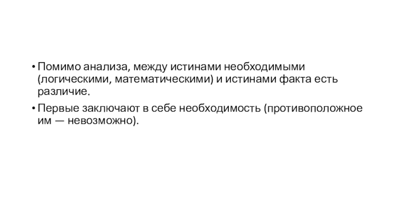 Слайд 33Помимо анализа, между истинами необходимыми (логическими, математическими) и истинами факта