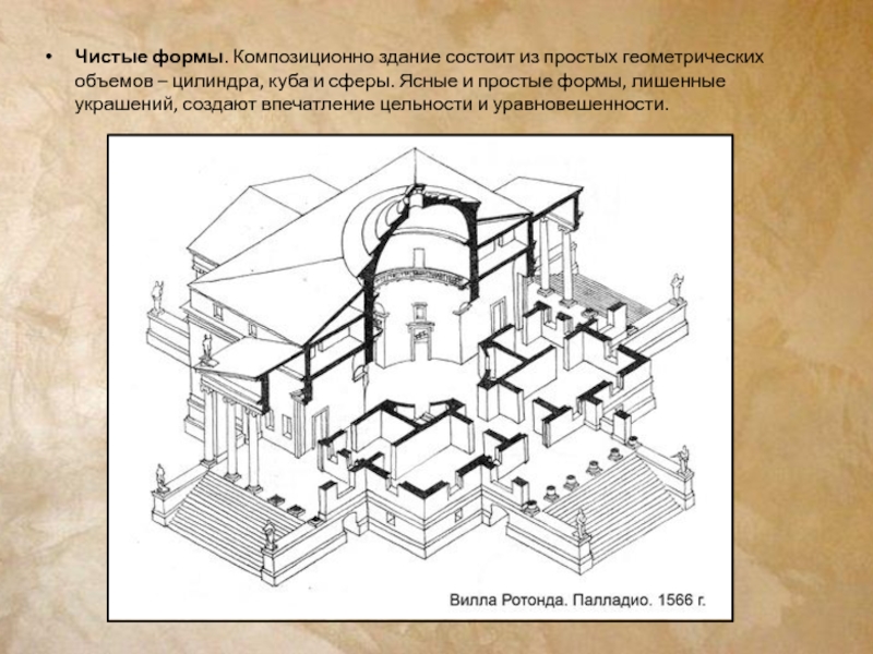 Слайд 9Чистые формы. Композиционно здание состоит из простых геометрических объемов –