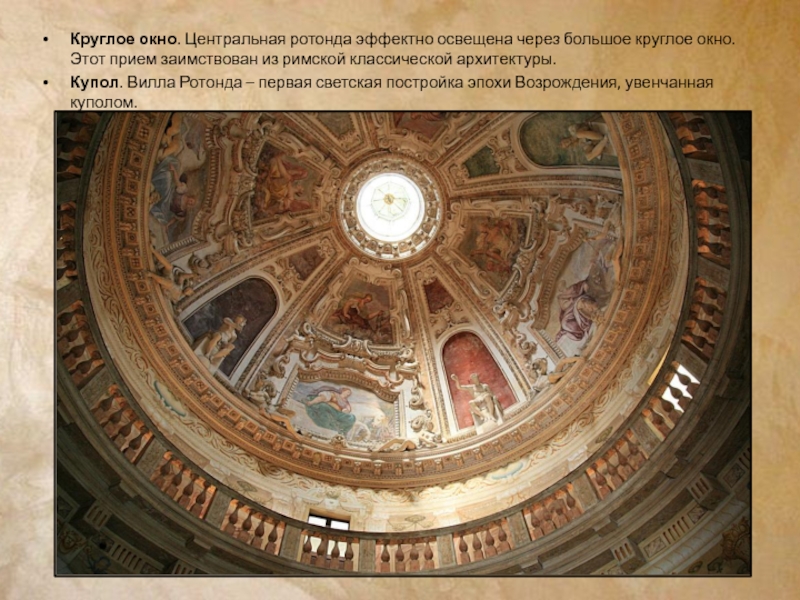 Слайд 7Круглое окно. Центральная ротонда эффектно освещена через большое круглое окно.