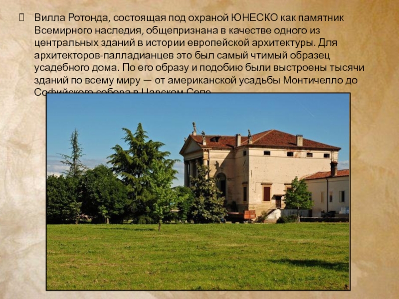 Слайд 5Вилла Ротонда, состоящая под охраной ЮНЕСКО как памятник Всемирного наследия,