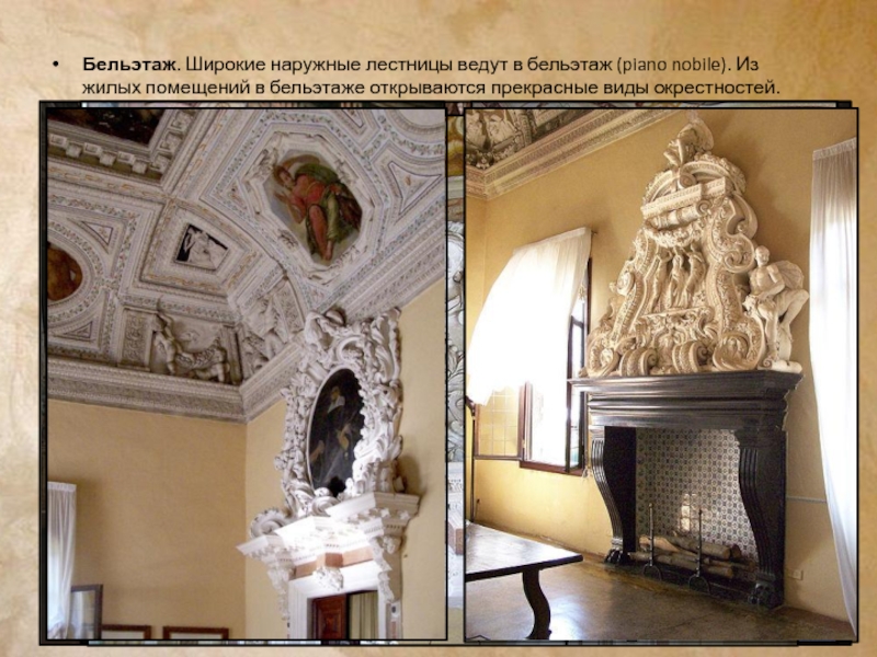 Слайд 8Бельэтаж. Широкие наружные лестницы ведут в бельэтаж (piano nobile). Из