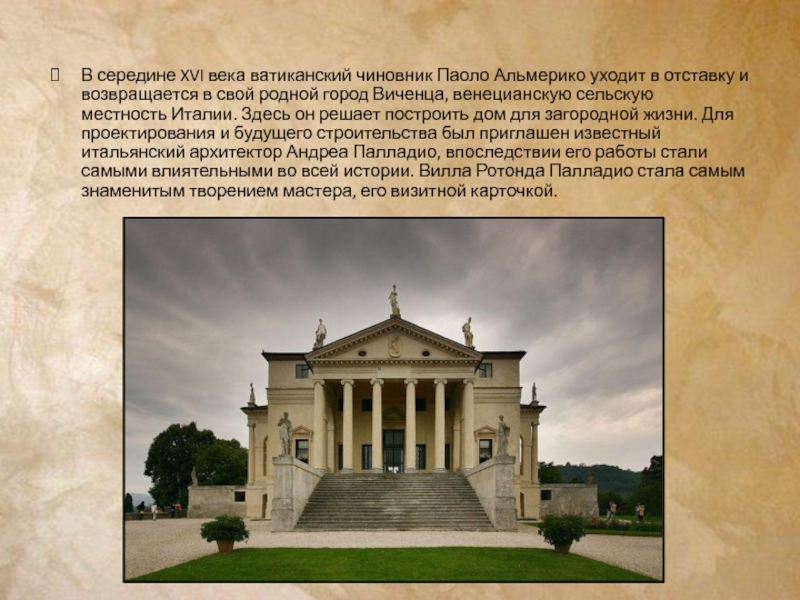 местность Италии. Здесь он решает построить дом для загородной жизни. Для проектирования и будущего строительства был приглашен известный итальянский архитектор Андреа Палладио, впоследствии его работы стали самыми влиятельными во всей истории. Вилла Ротонда Палладио стала самым знаменитым творением мастера, его визитной карточкой.