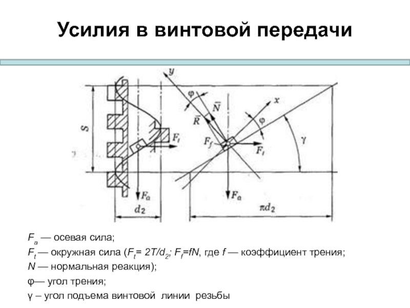Усилия в винтовой передачиFa — осевая сила; Ft — окружная сила (Ft= 2T/d2; Ff=fN, где f —