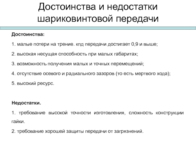 Достоинства и недостатки шариковинтовой передачиДостоинства: 1. малые потери на трение. кпд передачи достигает 0,9 и выше;2. высокая