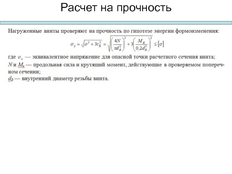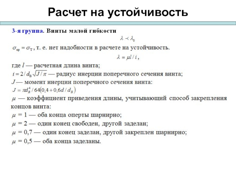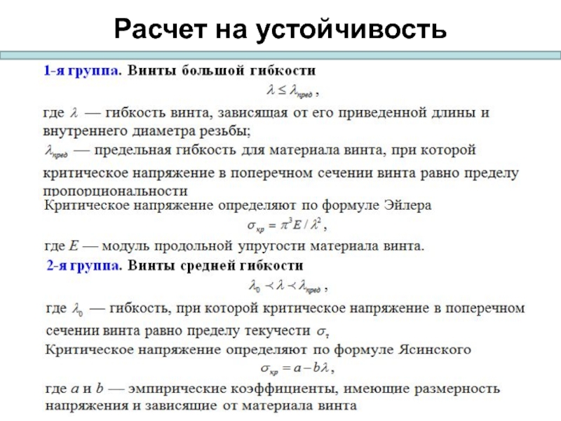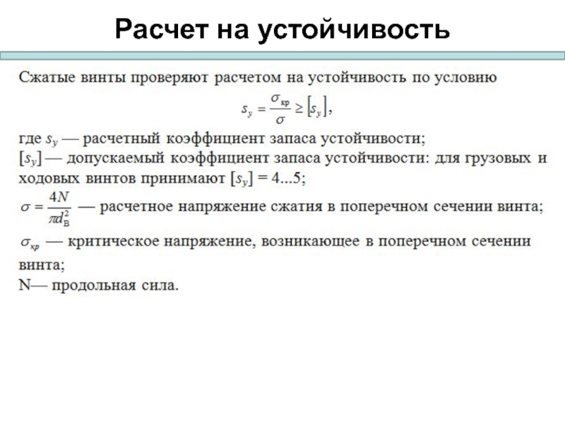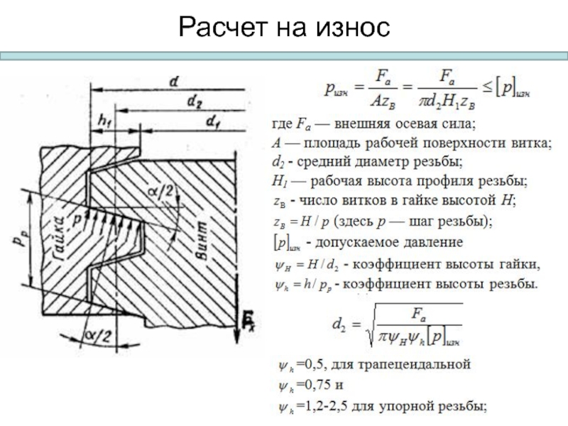 Расчет передачи винт-гайкаРасчет на износ (определяется диаметр винта и высота гайки)Расчет на прочностьРасчет на устойчивость