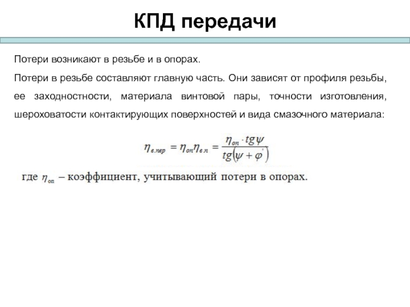 КПД передачиПотери возникают в резьбе и в опорах. Потери в резьбе составляют главную часть. Они зависят от