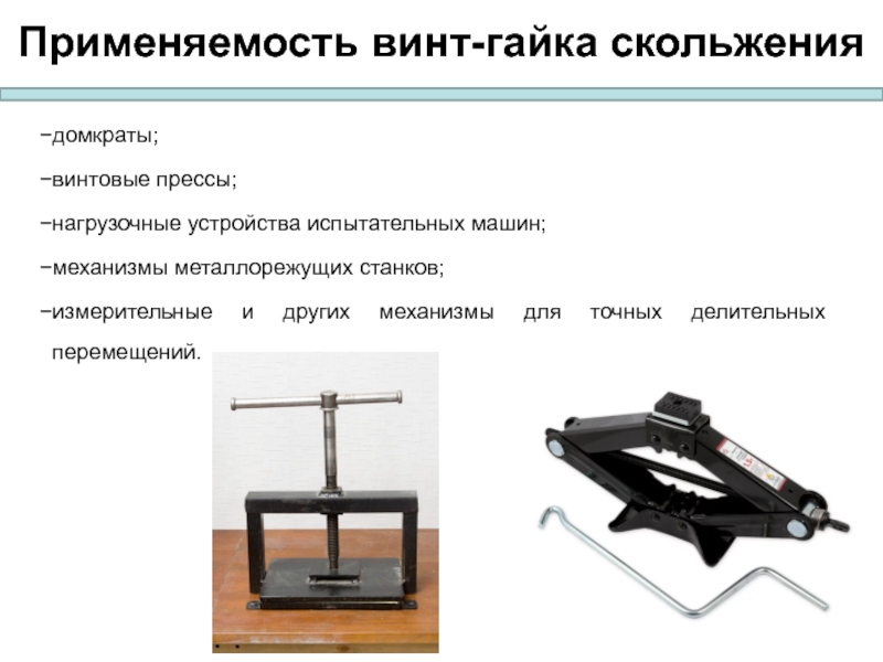 Применяемость винт-гайка скольжения домкраты;винтовые прессы;нагрузочные устройства испытательных машин;механизмы металлорежущих станков;измерительные и других механизмы для точных делительных перемещений.